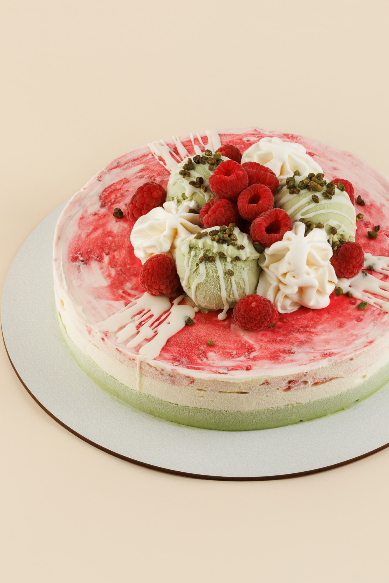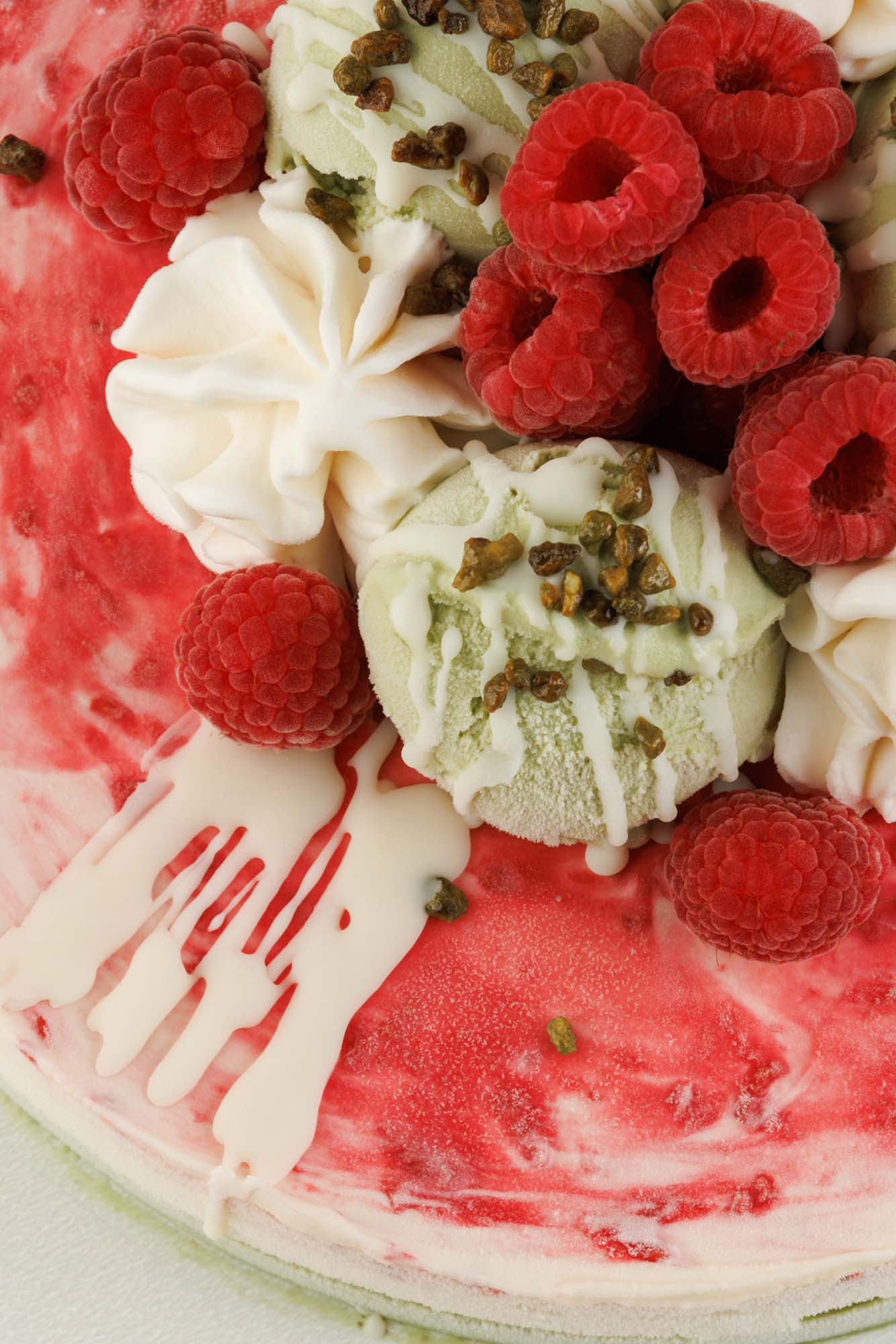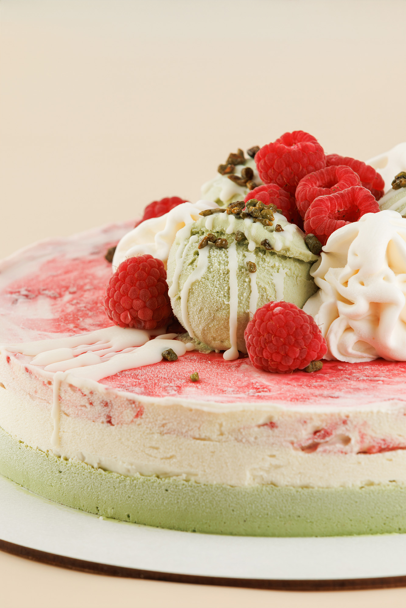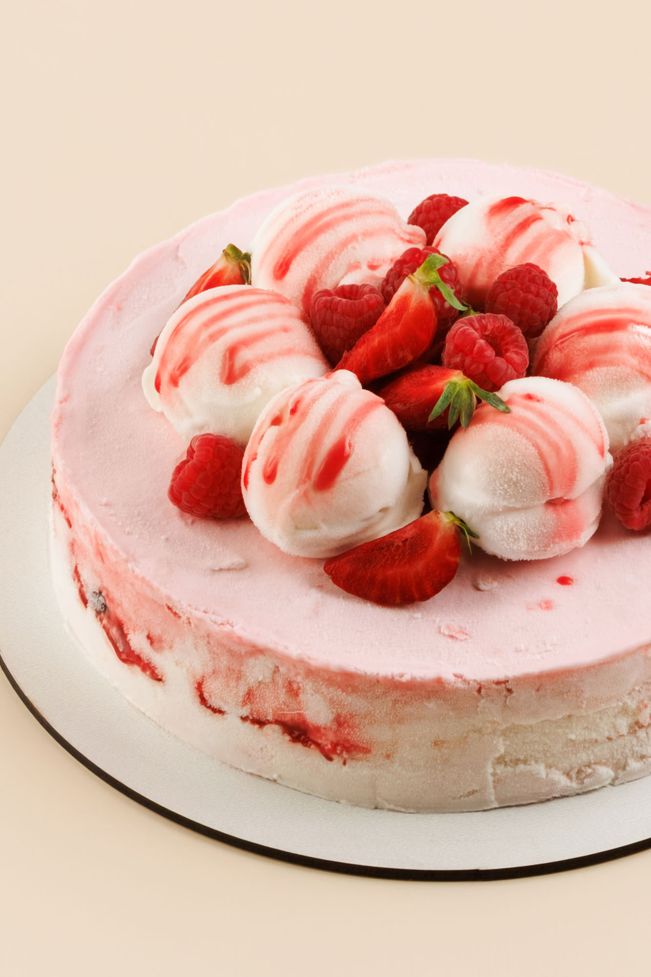 Торт декорируется шариками джелато, политыми вишнёвым топпингом, и ягодами (малиной, вишней и клубникой).