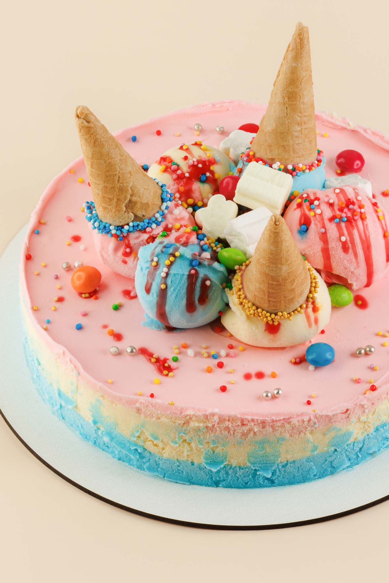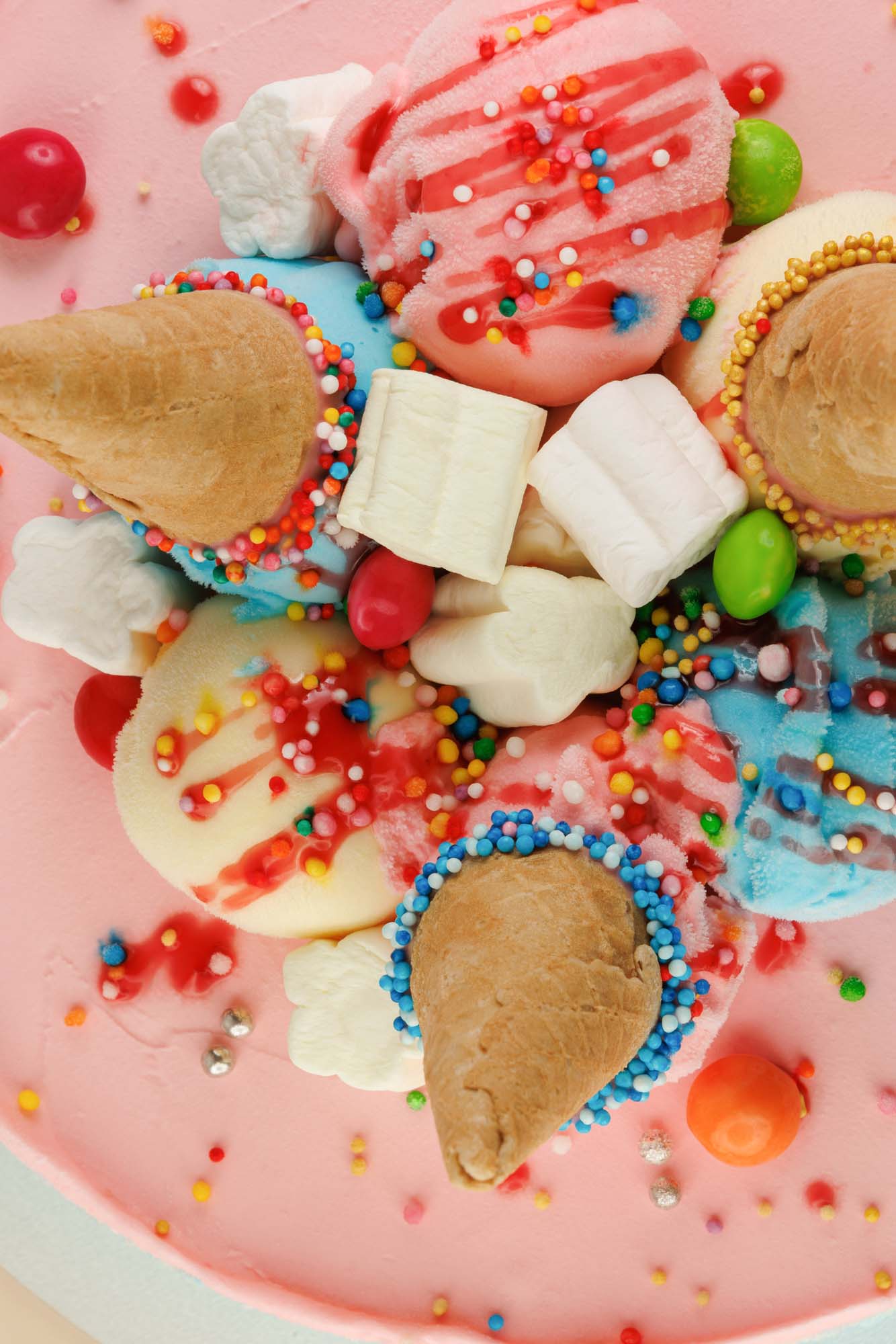 Торт декорируется шариками джелато в вафельных рожках, разноцветными посыпками и маршмеллоу.